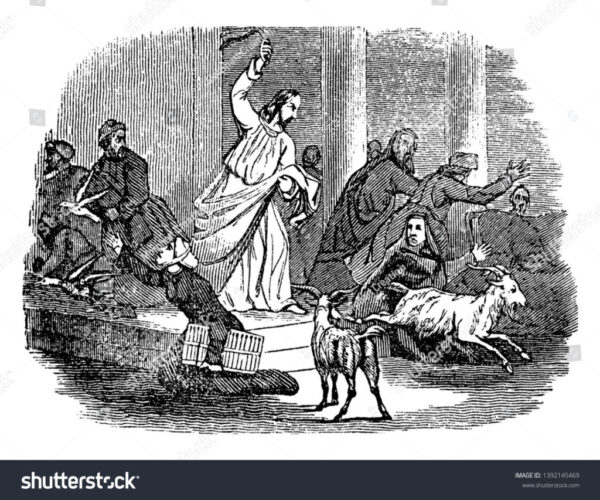 Au temps de Jésus, les vendeurs d’animaux avaient envahi le parvis avec leur bétail pour les sacrifices. Comme on ne pouvait verser de dons pour le temple avec une monnaie d’origine païenne, les changeurs étaient nécessaires. Encombré et bruyant, le parvis était devenu un centre commercial et bloquait l’accès sanctuaire, lieu de la prière.