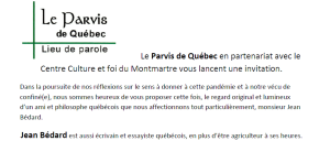 Le Parvis de Québec en partenariat avec le Centre Culture et foi du Montmartre vous lancent une invitation. Dans la poursuite de nos réflexions sur le sens à donner à cette pandémie et à notre vécu de confiné (e), nous sommes heureux de vous proposer cette fois, le regard original et lumineux d’un ami et philosophe québécois que nous affectionnons tout particulièrement, monsieur Jean Bédard. Ce sera le jeudi 10 juin 2021 à 19 heures.