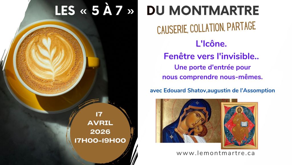5 à 7 du MONTMARTRE — CAUSERIE, COLLATION, PARTAGE Le moment idéal pour poser les questions qui nous préoccupent et débattre de nos intuitions ! À chaque rencontre, une personne-ressource… |