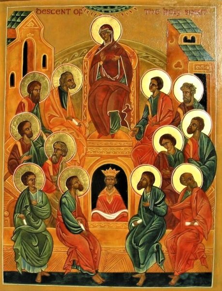 « Au terme des cinquante jours après Pâques, ils se trouvaient réunis tous ensemble », comme nous le disent les Actes des Apôtres. L’icône met en écriture d’image cette réunion des Apôtres. Sur l’icône, on nous rappelle la présence de Marie. C’est elle, Marie, qui apprend aux Apôtres l’importante vertu d’humilité. Il ne s’agit ni de soumission, ni de dépréciation de notre vocation humaine. Marie encourage les Apôtres à écouter en vérité! L’humilité nous amène à nous voir tels que nous sommes, devant le Seigneur, dans l’intimité abyssale de sa présence. Oui, tels que nous sommes avec nos grandeurs et nos petitesses. Cette écoute des profondeurs de nos vies ne connaît pas de finitude et devient possible avec l’Esprit Saint qui nous révèle l’Amour infini du Père.